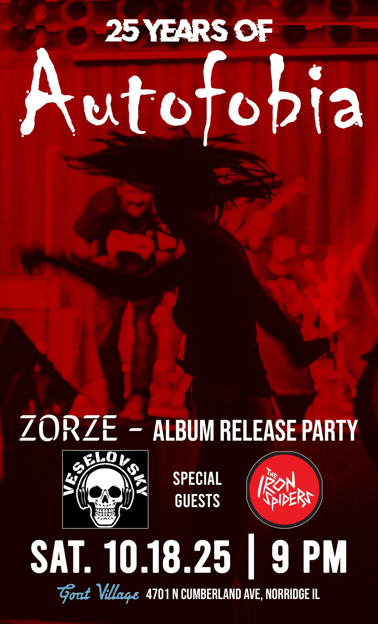 25 Years of Autofobia - "Zorze" Album Release PartyAutofobia , Veselovsky , The Iron Spiders📅 October 18, 2025, doors: 8:00PM🏛️ Goat Village📍 4701 N. Cumberland, Norridge, IL 60706🔗 More Info